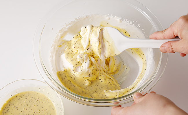 パッションフルーツソースを3回に分けて加え、その都度ゴムベラで混ぜ合わせる。