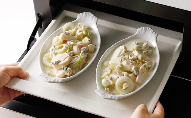 焼く- 角皿にのせてレンジグリルに入れ、【レンジ5分▶グリル15分】に設定し、自動リレー調理で加熱する。