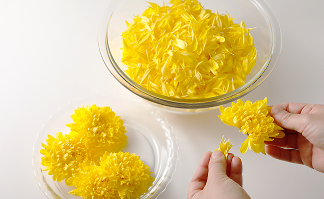 下ごしらえをする- 食用菊は花びらを摘みとる。酢を加えた熱湯に花びらを入れ、さっとゆでて水にとり、水気を絞る。