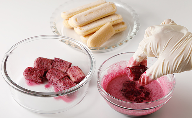 - ブドウソースはさっと浸すだけではフィンガービスケットに染み込まないので、フィンガービスケットを半分に折ってからしっかりと浸すのがコツです。