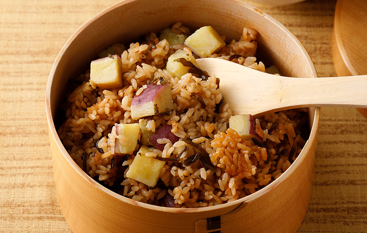旬食材の代表格さつま芋は四角に切って入れるだけ。簡単炊き込みごはんです。塩こんぶから出るダシと塩気がさつま芋の甘味やホクホク感と相まって、たまらなくおいしい!おかわり必至です。さつま芋の種類で口当たりや味が変わるので、何度も作りたくなるごはんです。