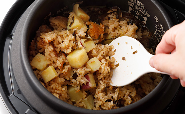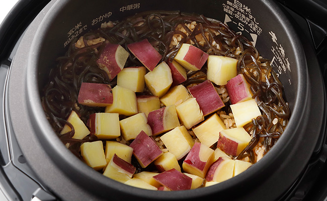 炊く- ①の米に酒を加え混ぜて塩こんぶを散らし、①のさつま芋をのせて炊飯器の設定を【お米/白米】、【炊き方/ふつう】にして炊く。