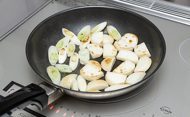 炒める- フライパンに油大さじ1/2を入れて【火力6】にし、長ネギとカブを並べ入れて両面に焼き色がつくまで焼き、取り出す。