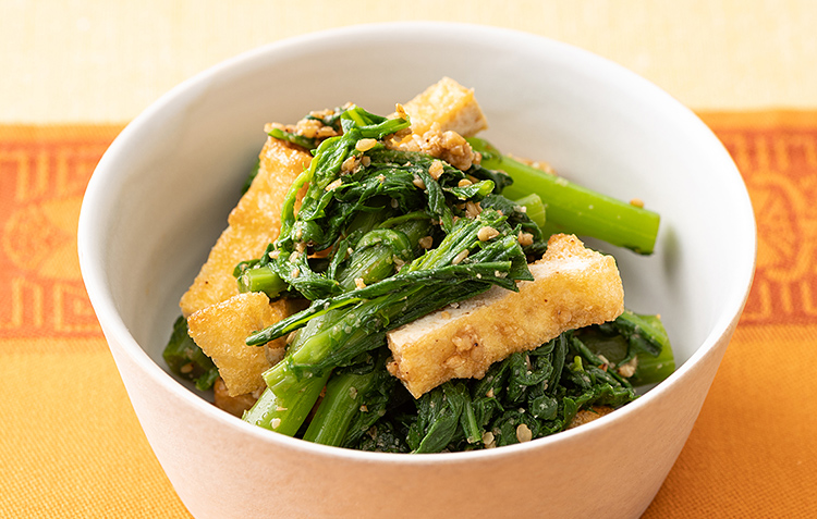 春菊の苦みと油揚げの食感、調味料のごま酢がマッチした和えもの。はちみつの自然な甘さと酢の酸味が箸休めにピッタリ。春菊は下ゆでして保存しておけば副菜の一品として便利に使えます。