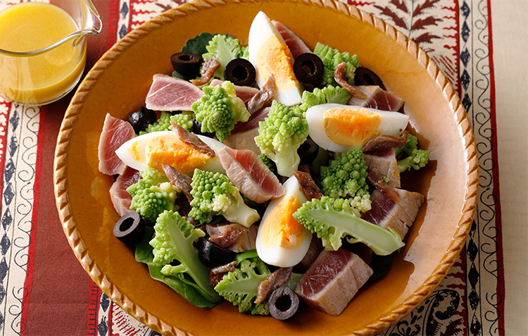 盛る- 器にロマネスコ、まぐろ、ゆで卵、あればベビーリーフなどの葉野菜を盛り、ブラックオリーブとアンチョビを散らしてドレッシングを添える。