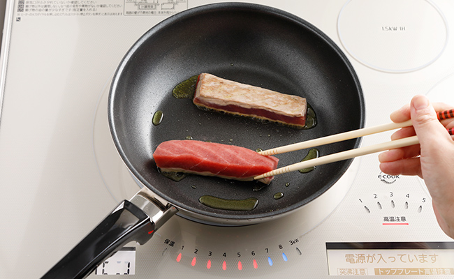 まぐろを焼く- フライパンにオリーブ油を入れて【火力6】で熱し、まぐろを並べ入れ、それぞれ片面20〜30秒ずつ焼き、バットなどにとり出して冷蔵庫で冷やしておく。
