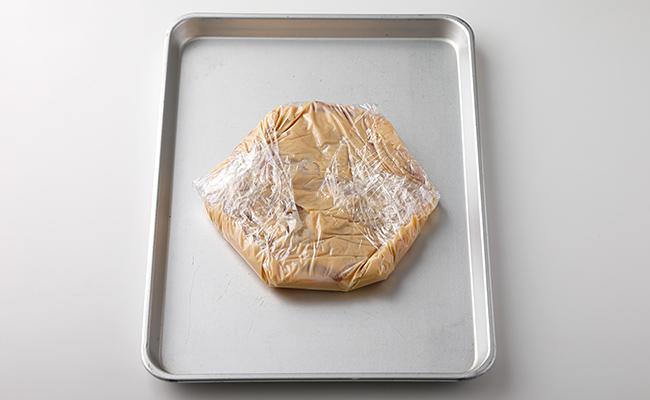 その上に豚肉を並べ、残りのみそ床をぬり広げ、ラップの上下、左右を折ってぴったりと包み、バットなどにのせて冷蔵庫で4時間以上漬ける。