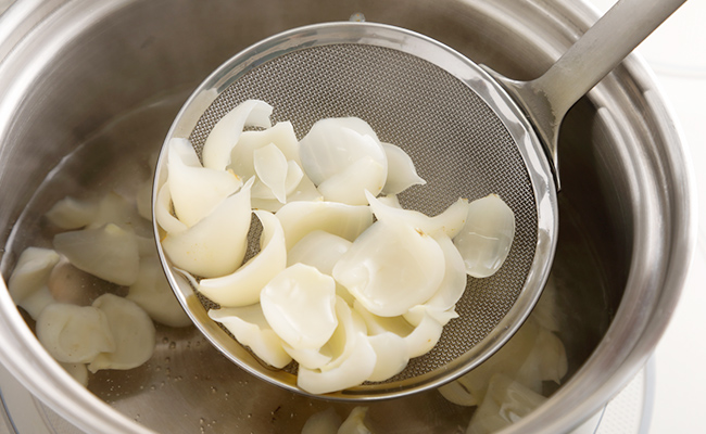 下ごしらえをする- ゆり根は一枚ずつはがして洗い、よごれた部分は包丁でそぎとり、大きいものは半分に切る。塩を加えた熱湯で1~2分、ややかためにゆでて冷水にとり、ザルにあげて水気を切る。