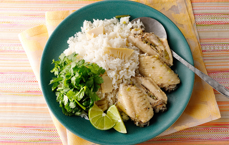 盛る- 器にご飯、手羽先を盛り、香菜、ライムを添える。