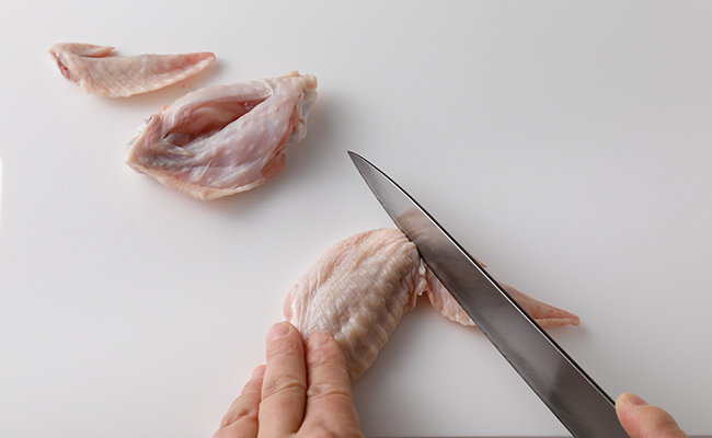 下ごしらえをする- 手羽先は手先を切り落とし、骨に沿って1本切り込みを入れる。切り落とした手先はとっておく。(※「エスニック鶏スープ」レシピで活用)