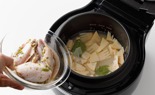 こぶみかんの葉、タケノコ、手羽先を順にのせ、漬け汁を鶏肉の上にかけ、炊飯器の設定を【お米/長粒米/ジャスミン米】にして炊く。