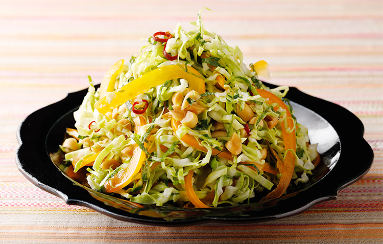 柔らかい春キャベツをたくさん食べられる一品。ヌクマムを使用したドレッシングとピーナッツの香ばしさ、ニンニクの風味で箸が止まらない、あと引くおいしさです。
