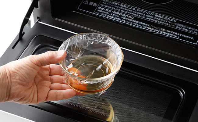 合わせ調味料を作る- 耐熱容器に調味料の材料すべてを入れ、ラップをして【レンジ】【手動600W】で1分加熱し、取り出す。まだ温かいうちにニンニク、赤唐辛子を加え混ぜ、冷ます。