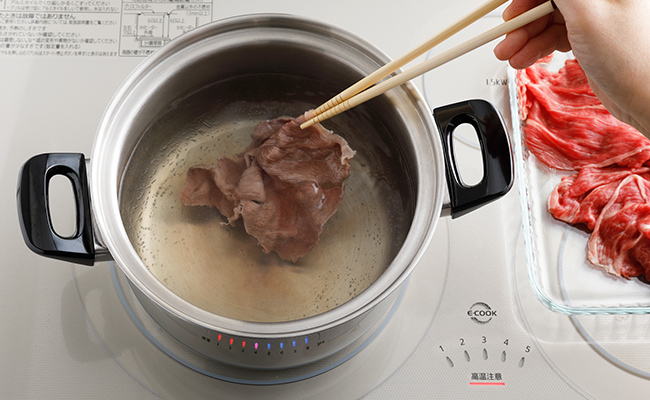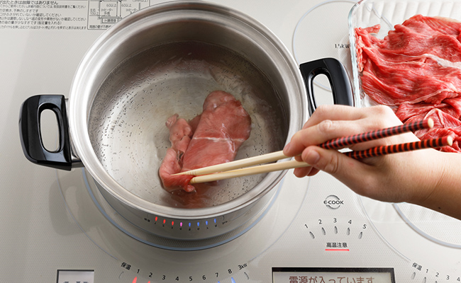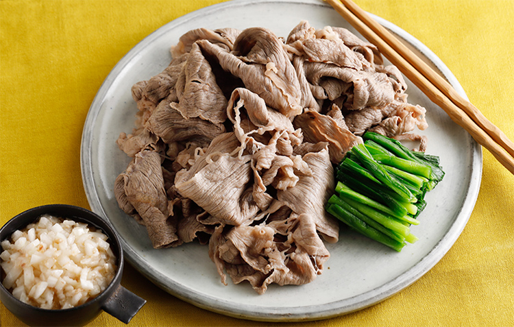 - 牛肉は沸騰したお湯でゆでると肉質がかたくなり、旨みも逃げてしまいます。また、一度に多くの牛肉を入れてしまうと温度が急激に下がってしまったり、肉が重なって均一に火が入りにくくなってしまったりするため、一枚ずつ広げ入れてゆでるようにします。