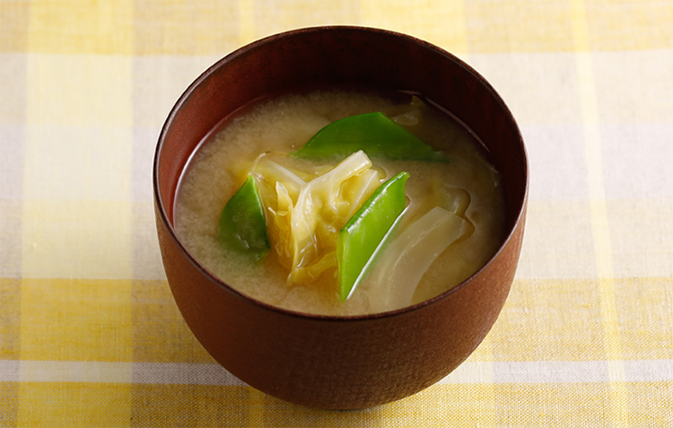 - 柔らかくて甘い春キャベツと清々しい風味の絹サヤがおいしい春の味わいのみそ汁です。