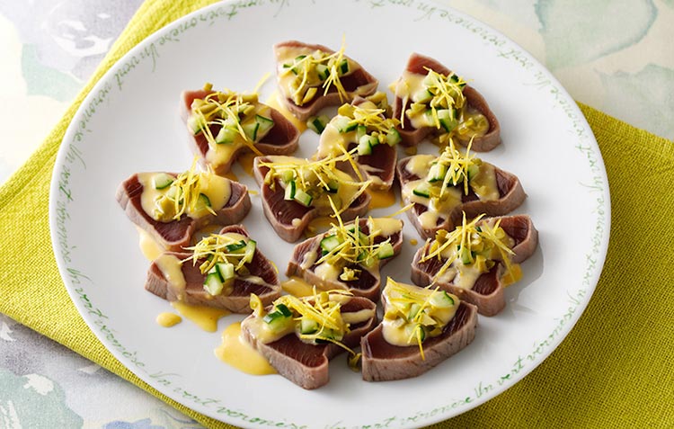 5~6月に獲れるかつおは、戻りがつおに比べて脂が少ないので、卵黄やマスタードを使ったクリーミーなソースとよく合います。ソースにはレモンを加えて、コクの中にもさっぱりと爽やかな仕上がりに。かつおは70~80℃の湯でさっとゆでると独特の生臭さが消え、かつおの風味を楽しめます。キュウリと共に初夏を感じられるカルパッチョです。
