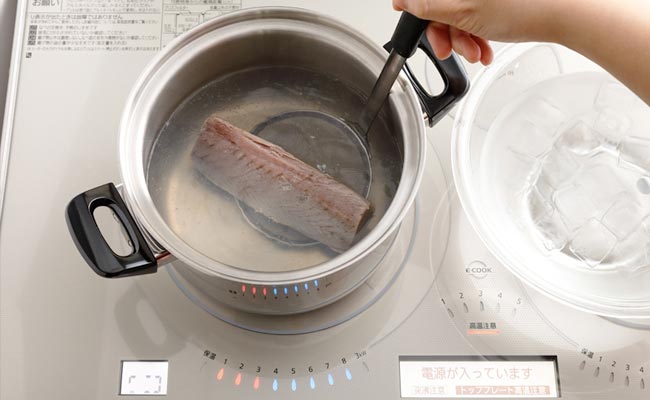 下ごしらえをする- 塩を加えた湯を【火力3~4】にかけ、鍋底から気泡が出てきたくらいの状態でかつおを柵のまま入れ、色が変わったら氷水にとり、水気をペーパータオルでおさえて冷蔵庫で直前まで冷やす。