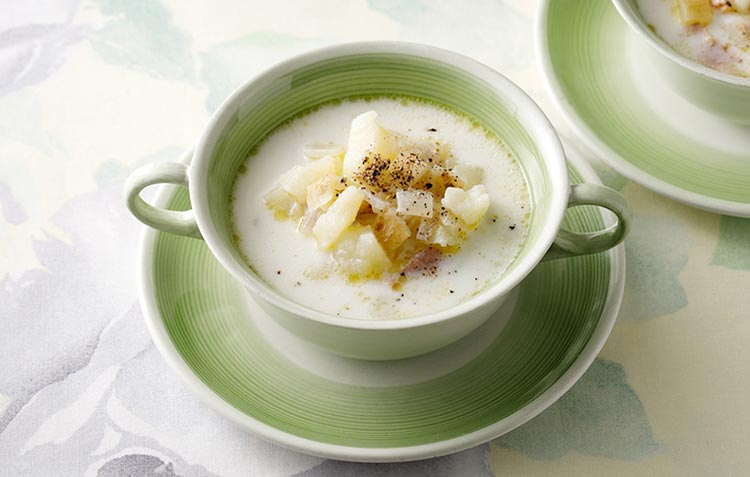新ジャガイモは瑞々しく、皮ごと食べられるのが特徴。ゆでてから粗くつぶし、皮は炒めた新ジャガイモの風味を生かした優しいスープです。タマネギの甘みとベーコンのコク、牛乳のまろやかさが新ジャガイモの風味とマッチ。皮が重要なポイントとなる新ジャガイモの使い切りレシピです。