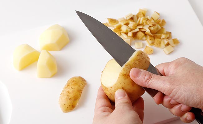 下ごしらえをする- 新ジャガイモはよく洗ってから少し厚めに包丁で皮をむき、2~4等分に切る。むいた皮は1cm角に切る。それぞれ調理直前まで水にさらし、ザルにあげて水気を切る。