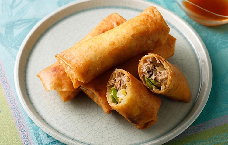 和の食材の漬けかつおとソラ豆を具材にしたボリューム満点の春巻きです。脂が少なくあっさりとしたかつおは漬けにすることでおいしさがギュッと凝縮され、揚げるとふっくらジューシーに。春巻きの皮の2枚使いで、中はしっとり外はパリッと香ばしく仕上がります。ぜひ、お試しください。