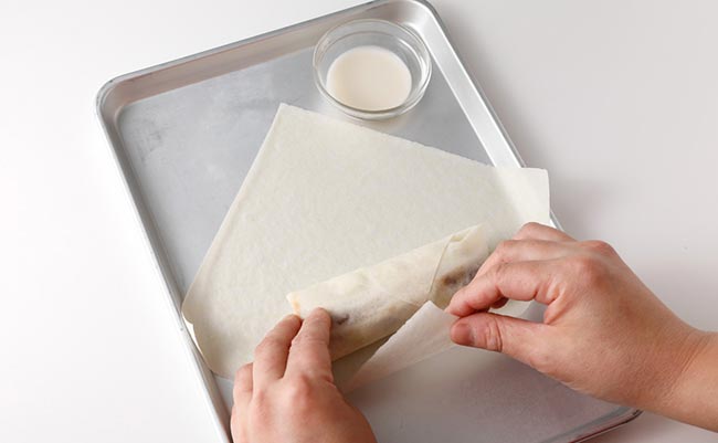 揚げる直前に巻いた春巻きをもう一枚の皮で巻き、巻き終わりをのりで止める