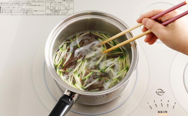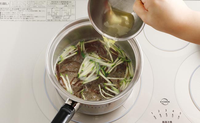 煮る- 鍋にズッキーニ、キクラゲ、スープ調味料すべてを入れて【火力6】で加熱し、煮立ったら【火力4~5】にして卵白をまわし入れ、ふわっと浮いてきたら調味料を加え、軽く混ぜて火を止める。