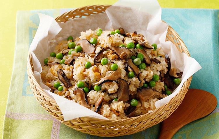 炊飯器で作る中華おこわです。干しシイタケと干しエビの凝縮された旨みとゴマ油の香りが広がり、本格的な仕上がりになります。炊きあがりに混ぜる旬のグリンピースの程よい噛み応えと甘み、香りがおこわにアクセントを加え、さらに食欲をそそります。ぜひ、サヤ付きのグリンピースを使ってみてください。