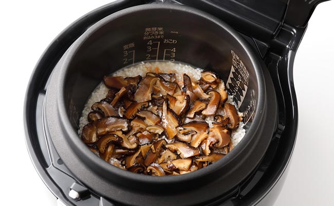 干しシイタケを広げのせ、【お米/白米】【炊き方/おこわ】にして炊く。