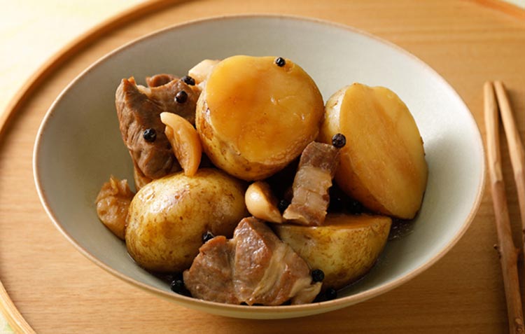 大きめに切った豚肩ロース肉と新ジャガイモを使った、ゴロッと食べ応えのある変わり肉ジャガです。ニンニクのコクとホールの黒コショウを噛んだときのピリッとした辛みがアクセントになり、あと引く美味しさです。焼いて煮るまで深型フライパン一つで作れる、簡単なレシピです。