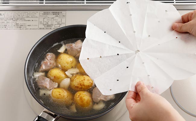 - オーブンシートで作った紙の落とし蓋は煮汁を吸収しづらいので、少ない煮汁でも味をむらなく染み込ませることができます。また、材料が柔らかくなってもオーブンシートだとあたりが優しいため、煮崩れを起こしにくいです。