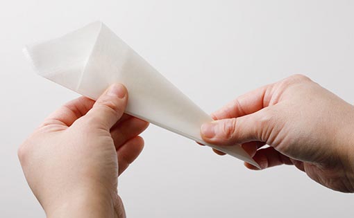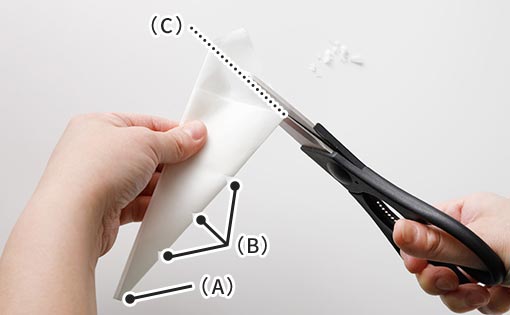 ③先端部分(A)を切り落とし、折り目に3か所切り込み(B)を入れて穴を開け、フライパンまたは鍋の直径に合わせて、頂点と反対側(C)を切ります。