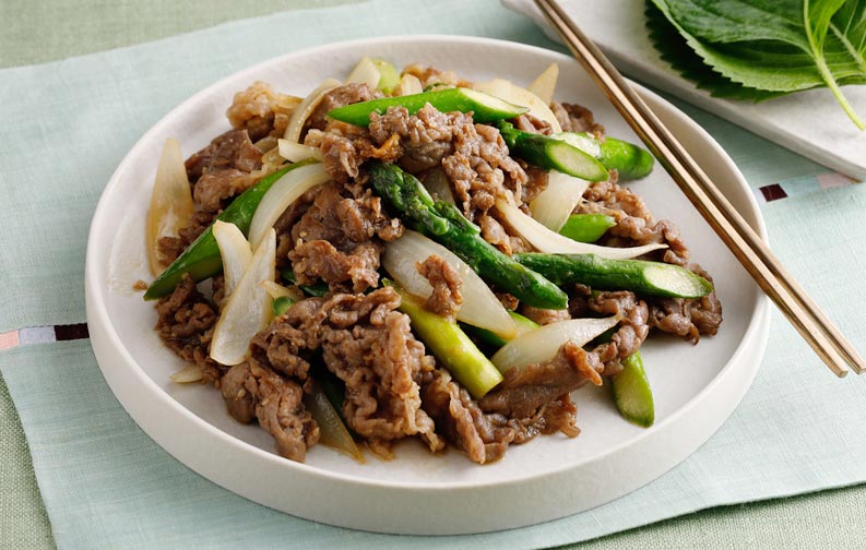 ハチミツを効かせた甘辛味のプルコギは、白いごはんにピッタリ!旬のアスパラガスをたっぷり入れた焼き肉です。エゴマの葉でプルコギを巻いて食べると、さわやかな清涼感ある風味が楽しめます。エゴマの葉の代わりに青ジソでもスッキリとした美味しさを味わえます。