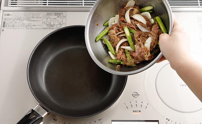 炒る- フライパンに漬けダレごと牛肉と野菜を広げ入れて【火力5~6】で加熱し、ときどき混ぜ合わせながら火が通るまで炒りつける。
