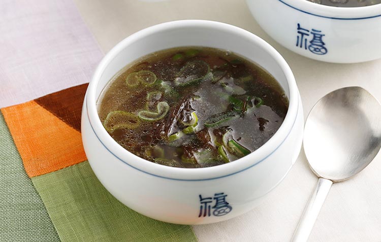 韓国料理のだしは日本と同様に煮干しと昆布です。そのだしに、もずくとゴマ油、ニンニクを入れた海の旨みたっぷりの韓国風スープに仕上げました。もずくのするっとしたのどごしが味わえてミネラルや食物繊維もとれる、味良し、栄養良しのスープです。