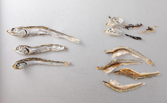 下ごしらえをする- 煮干しは頭とハラワタをとり除いて半分に裂く。