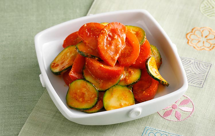ピリッとしたコチュジャンの辛みとトマトの酸味、ズッキーニの食感が意外な組み合わせのナムル。ズッキーニの使い道が広がる副菜です。トマトの水分が出てしまうので、食べる直前に和えるのがポイント。