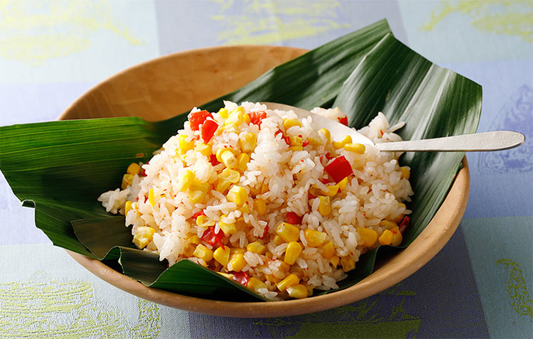 加熱すると香りと甘みがさらに増すトウモロコシを、中華風の炊き込みごはんに。トウモロコシの黄色とピーマンの赤い色が食卓をにぎやかに彩ります。具材のショウガは炒めることで風味が際立ち、トウモロコシの甘みが引き立ちます。
