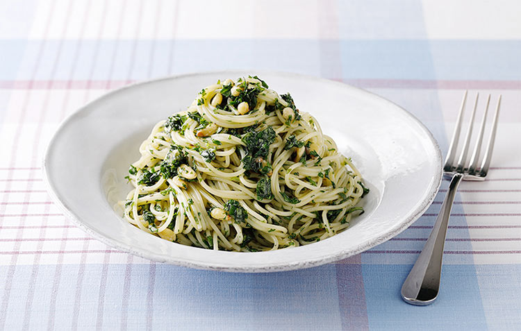ミキサーもフードプロセッサーも不要!イタリアンでお馴染みのジェノベーゼソースにパセリも加えたフレッシュハーブソースの冷製パスタです。添えものになりがちなパセリはビタミン、カリウム、鉄分など栄養豊富。さわやかなハーブとアンチョビ、ニンニクの風味が食欲をそそります。パスタのフェデリーニは、さっぱりとした味わいのソースと相性が良く、冷製だけでなく温かいソースで使用しても美味しいです。
