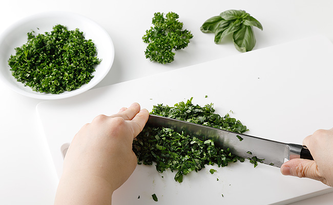 フレッシュハーブソースを作る- バジルとパセリはそれぞれみじん切りにし、ボウルに入れてオリーブ油を加え、よく絡める。