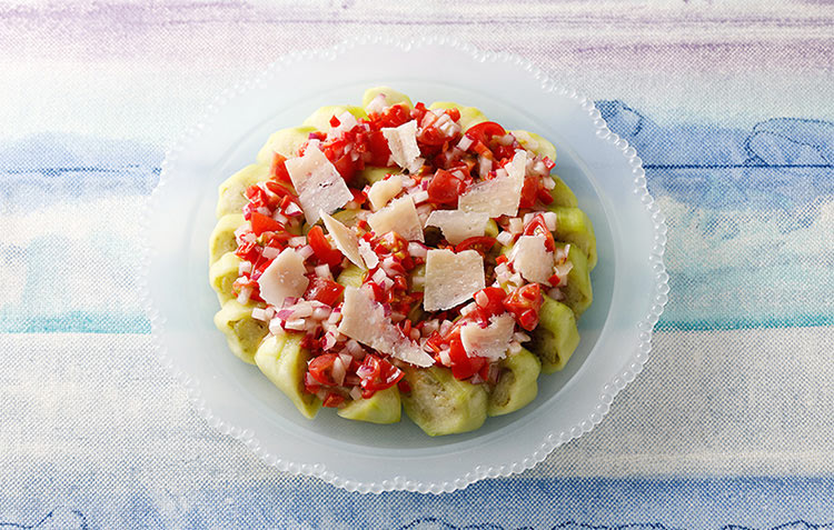 ゆでて冷やしたナスに酸味が効いた色鮮やかなラビゴットソースがマッチしてクセになりそう!夏のサラダの一品としてオススメです。