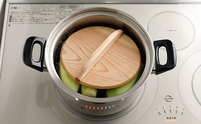 - 木の落とし蓋がない場合は、ゆで鍋より小さいサイズの鍋蓋などを使用してもよいです。