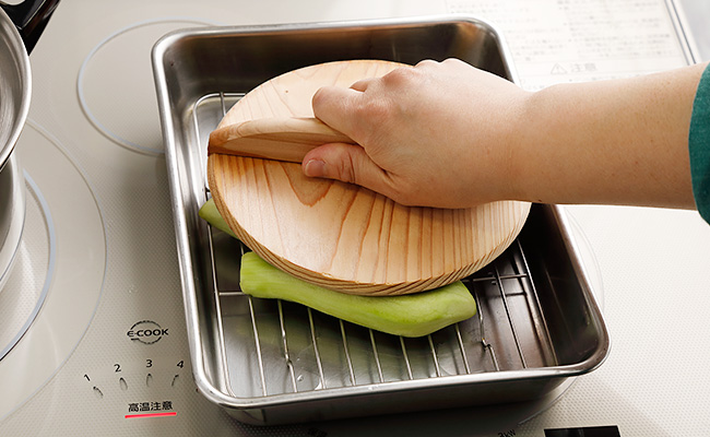 網をのせたバットにナスをとり出し、木の落とし蓋で上から軽く押して余分な水分を切る。冷蔵庫で冷やし、1cm厚さに切る。