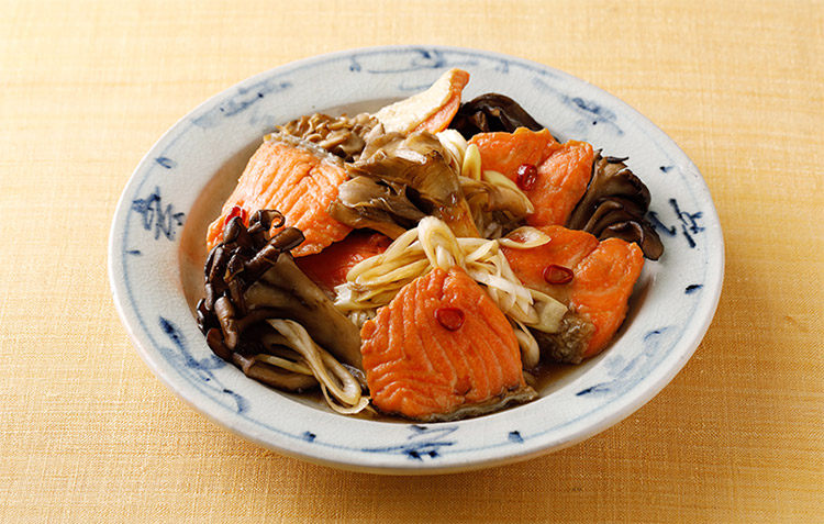 漬ける- バットに長ネギを広げ入れ、その上に揚げ焼きした鮭、舞茸を並べ入れる。南蛮酢をまわしかけ、しばらくおく。