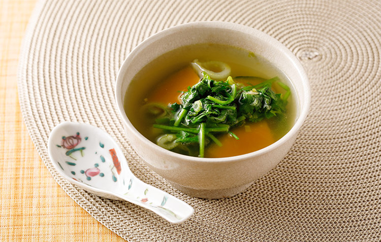 旬のカボチャと香菜を合わせた意外な組み合せのスープです。カボチャの甘みと香菜のエスニックな風味が口いっぱいに広がります。香菜は火を通しすぎないことがポイント。ぜひ試してもらいたい、くせになるスープです。