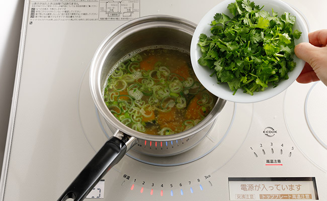 フタをとって【火力4】にし、煮立つ手前で香菜の茎と葉を加え、火を止める。