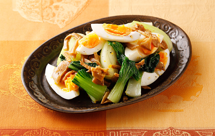 サッとゆでたチンゲンサイとゆで卵、市販の味付けメンマを和えて、ゴマ油を加えただけの驚くほど簡単便利な副菜です。チンゲンサイは根元部分をくし切りにすることで、歯ごたえをしっかり楽しめます。お酒のおつまみにも最適な一品です。