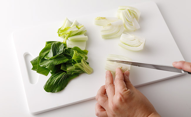 下ごしらえをする- チンゲンサイは根元から5cm長さのところで切り分ける。根元部分は縦に8等分に切り、茎と葉は3~4cm長さに切る。塩を加えた熱湯に根元、茎、葉の順に加え、さっと茹でて冷水にとり、水気を切る。