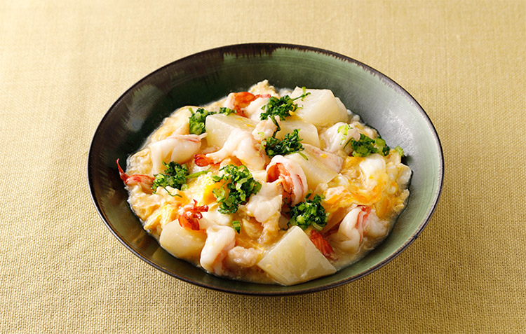 旬のカブとエビを煮て、トロミを付けてから卵とじにしました。やわらかなカブとプリプリのエビ、卵と煮汁がからんで優しい口当たりの卵とじです。エビと卵、カブの葉が色鮮やかに食卓を飾ります。あつあつのご飯にのせても美味しい。