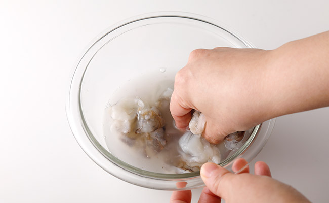 下ごしらえをする- エビは殻をむき、背に切り込みを入れて背ワタをとり除き、厚み半分に切る。塩を加えた水でエビをふり洗いし、汚れた水を捨て、再び塩を加えた水でさっと洗い流す。エビの水気をペーパータオルでおさえ、酒をふる。