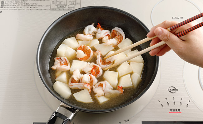 煮る- フライパンにカブ、調味料すべてを入れて【火力6】で加熱し、煮立ったらフタをして【火力3】でカブが柔らかくなるまで5~7分煮る。